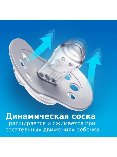 Изготовлена из гетерогенного силиконового слоя, который обеспечивает сжимание и расширение соски при сосательных движениях ребенка; симметричная форма соски основана на структуре соска.