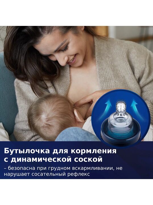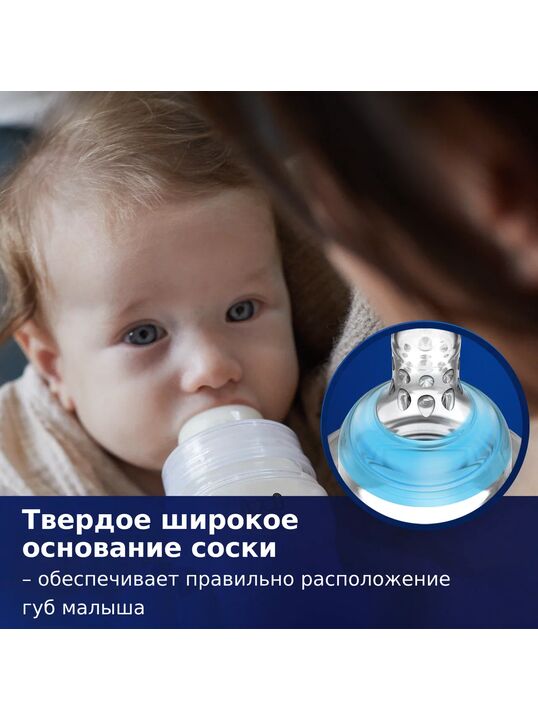 Детская бутылочка для кормления оснащена уникальной динамической соской из тонкого силикона, с жестким профилированным основанием и системой отвода воздуха Super Vent.