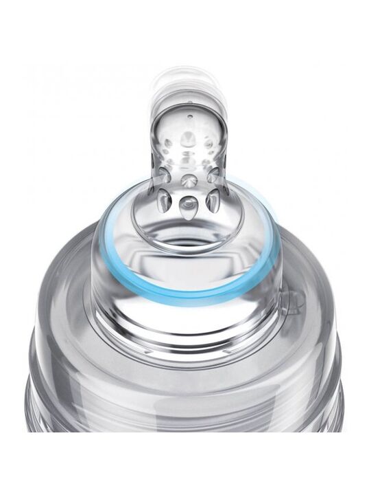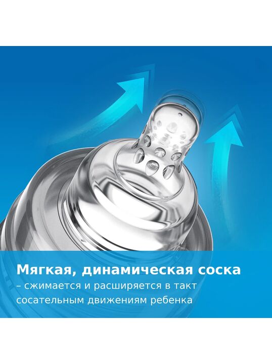 Детская бутылочка оснащена уникальной динамической соской из тонкого силикона, с жестким профилированным основанием и системой отвода воздуха Super Vent.