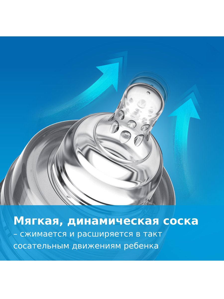 Детская бутылочка оснащена уникальной динамической соской из тонкого силикона, с жестким профилированным основанием и системой отвода воздуха Super Vent.