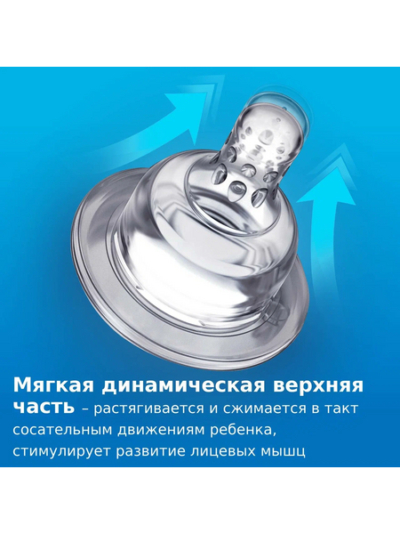 Мягкая и эластичная верхняя часть силиконовой соски растягивается и сжимается в такт сосательным движениям ребенка, стимулируя активную работу лицевых мышц.