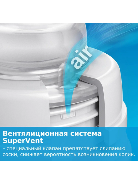 Новая эффективная система отвода воздуха SuperVent предотвращает смешивание молока с воздухом и, как следствие, уменьшает риск возникновения колик.