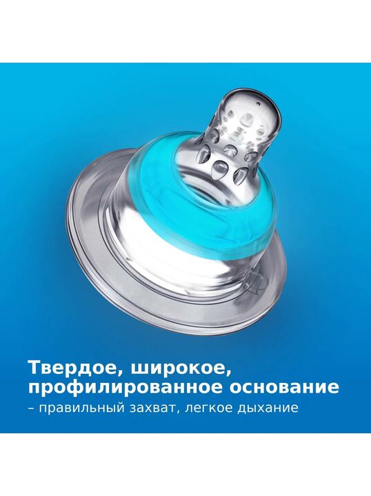 Плотное и широкое основание особой формы обеспечивает правильный захват, облегчая дыхание и препятствуя кусанию соски во время кормления.
