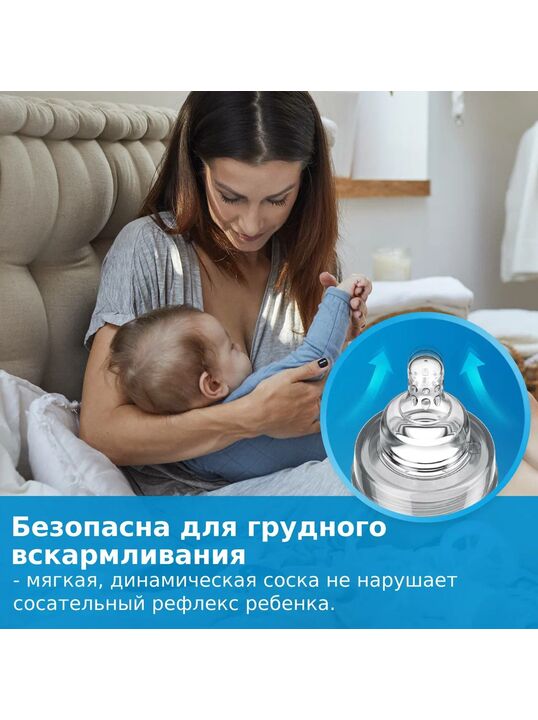 • Мягкая и динамическая соска на бутылку не нарушает сосательный рефлекс.