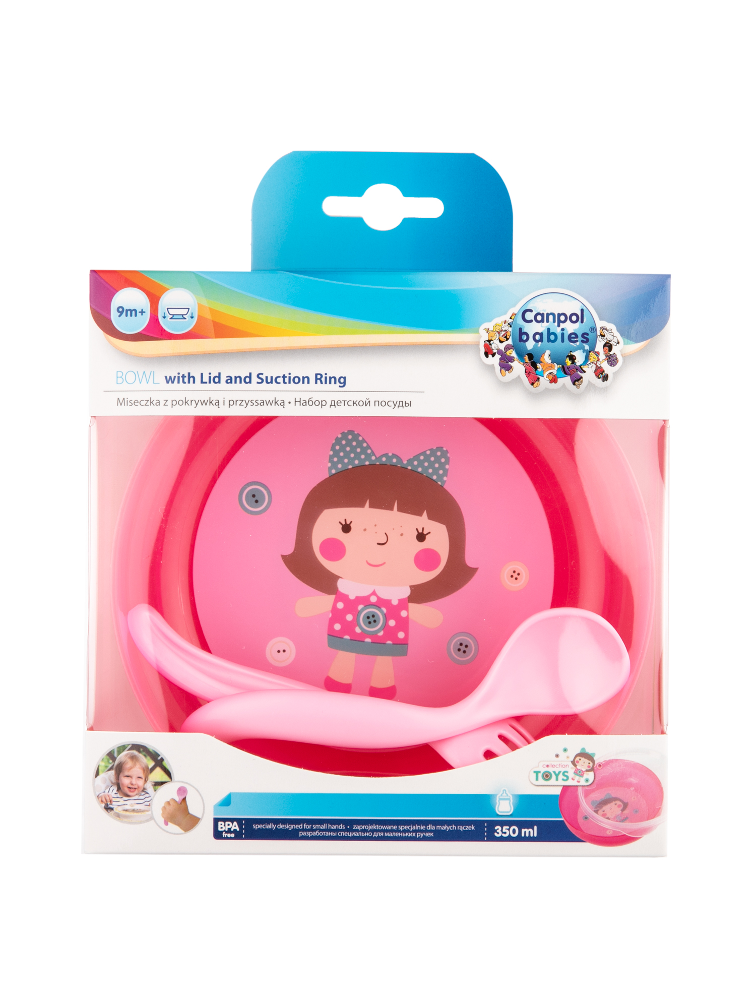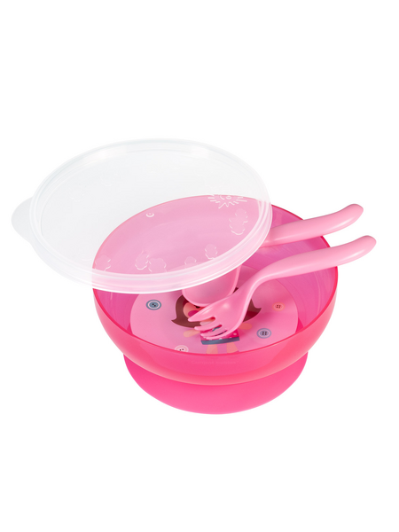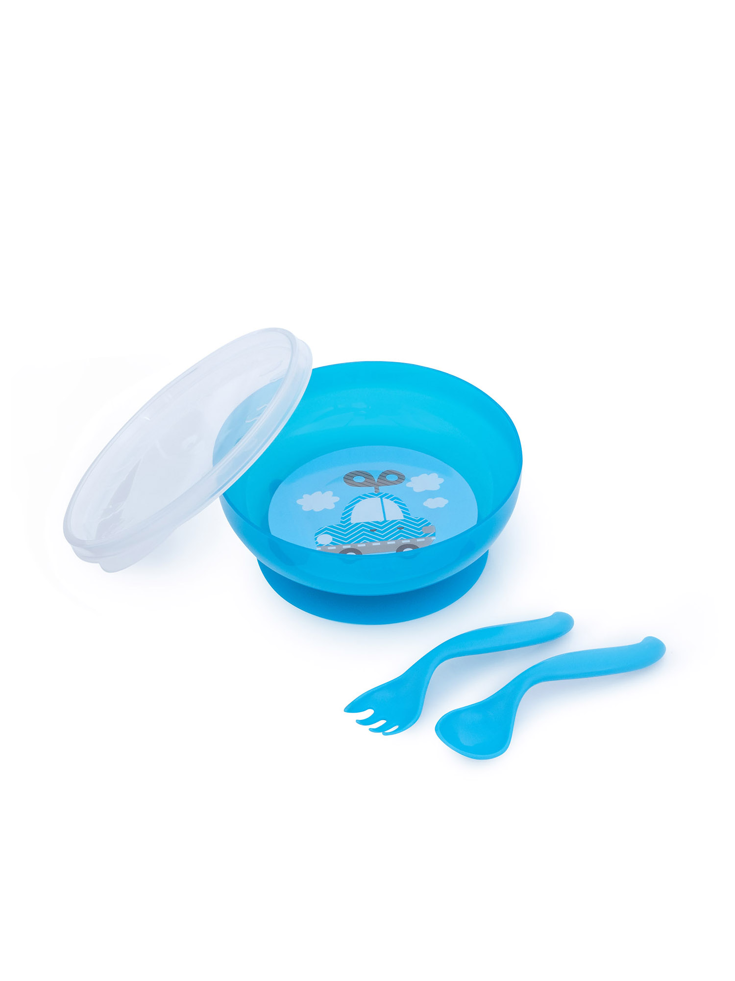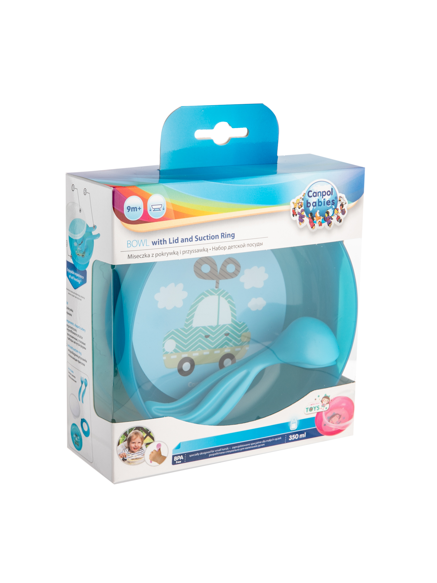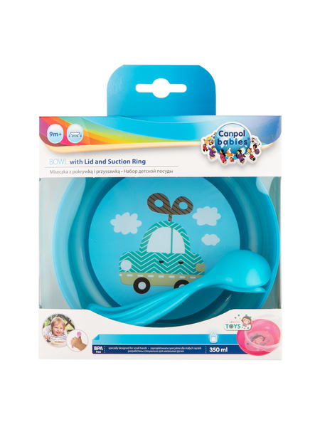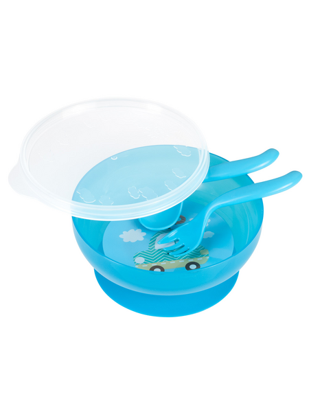 Пластиковая, небьющаяся миска с крышкой отлично защищает еду от быстрого охлаждения и проливания. Оснащена практичной присоской для предотвращения скольжения по столу. Идеально подходит для обучения самостоятельному приему пищи. Доступна в комплекте со столовыми приборами. Емкость 350 мл.