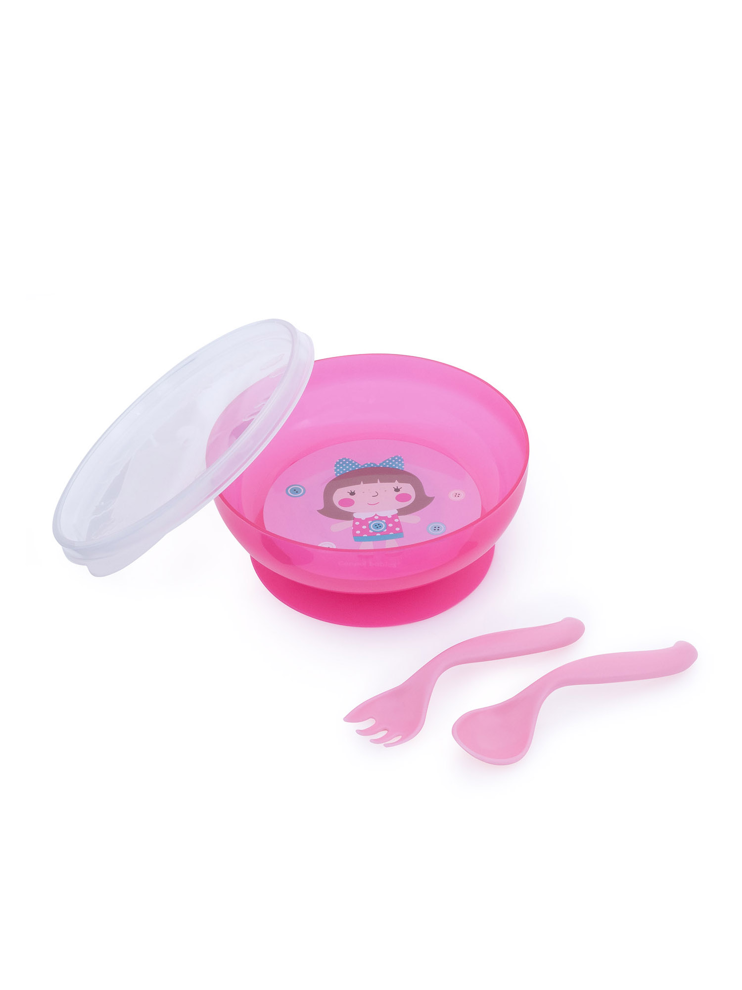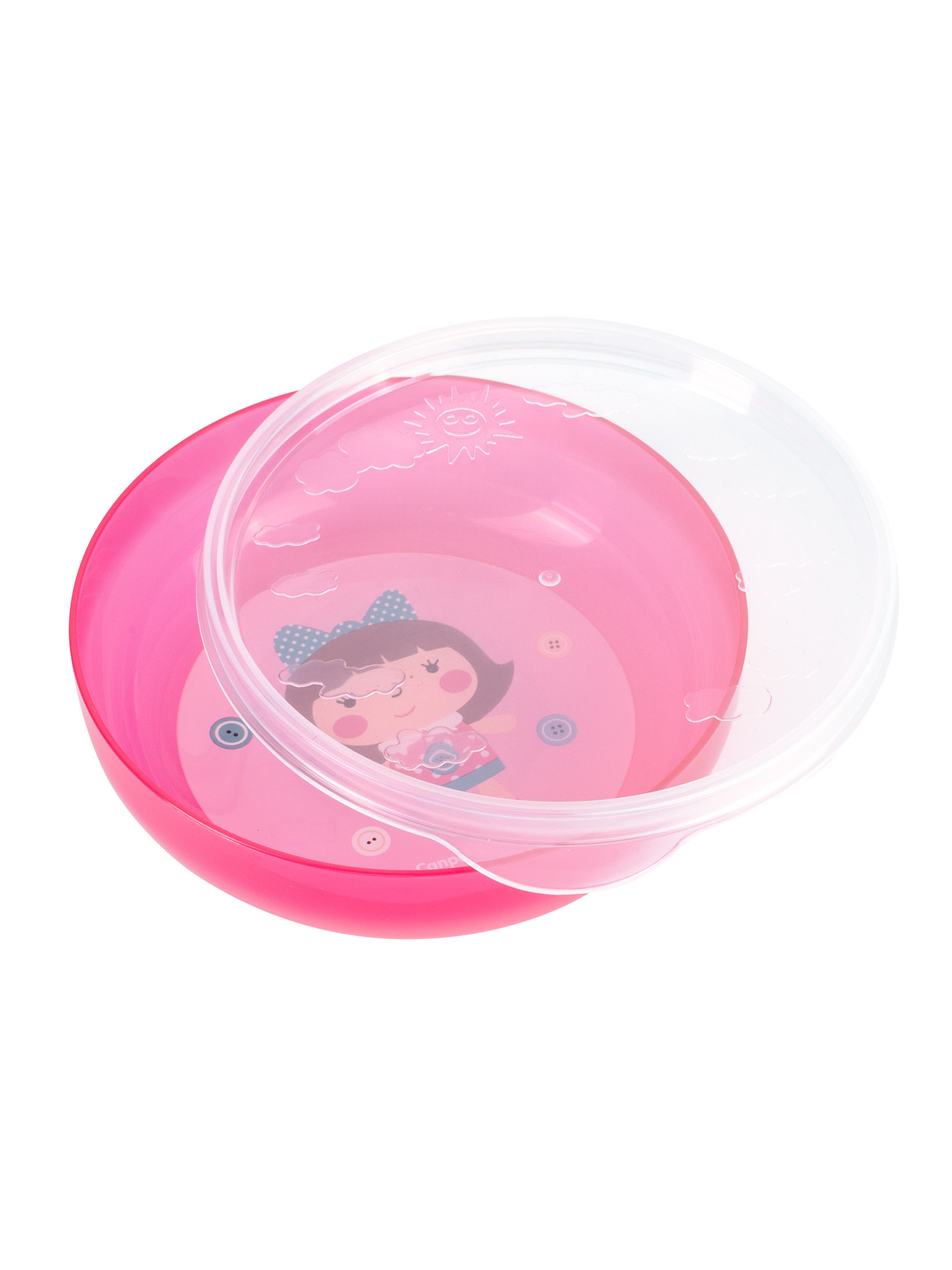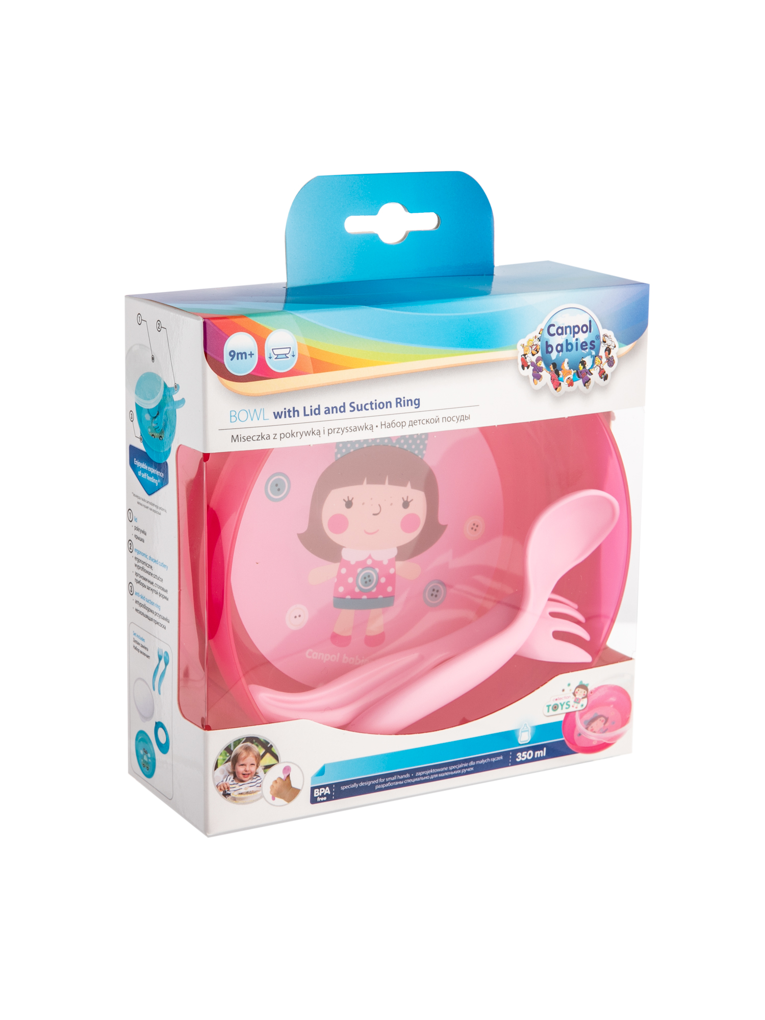 Пластиковая, небьющаяся миска с крышкой отлично защищает еду от быстрого охлаждения и проливания. Оснащена практичной присоской для предотвращения скольжения по столу. Идеально подходит для обучения самостоятельному приему пищи. Доступна в комплекте со столовыми приборами. Емкость 350 мл.