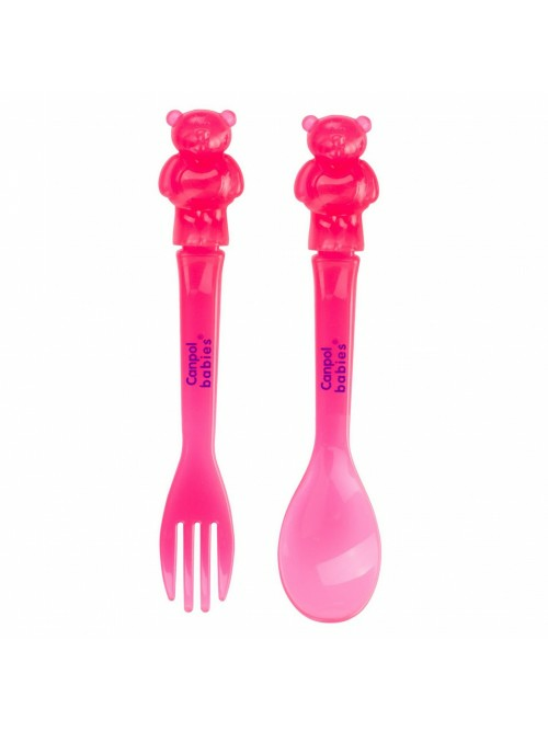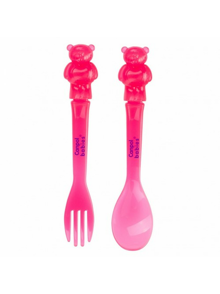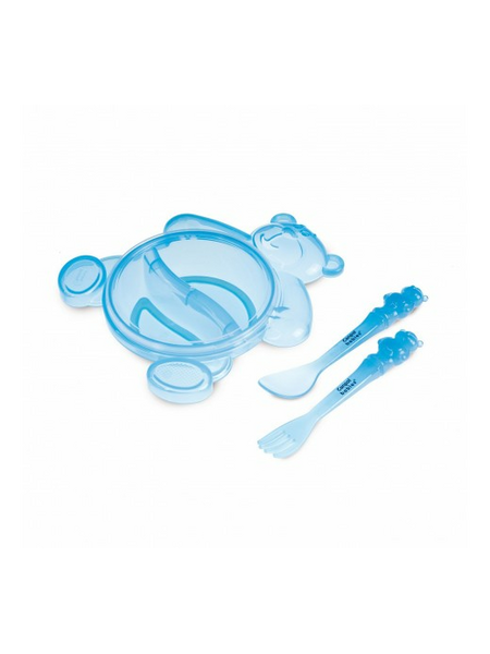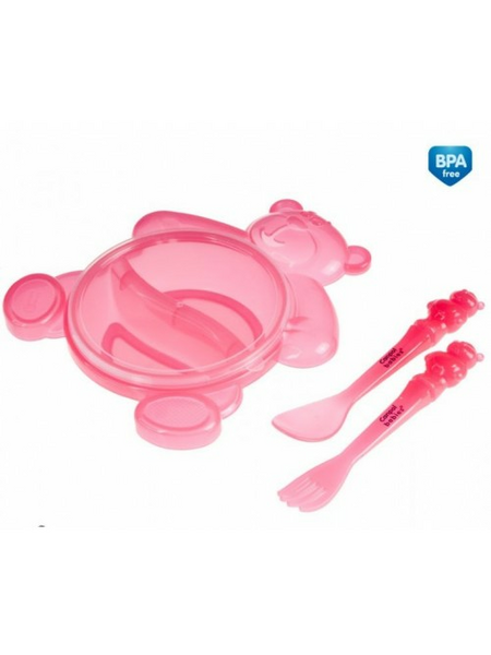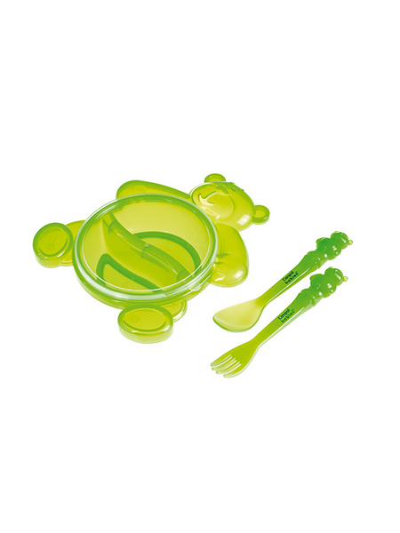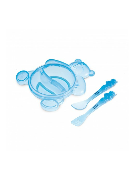 В комплект также входят столовые приборы - ложка и вилка - с закругленными краями, разработанные специально для нежных десен малыша.