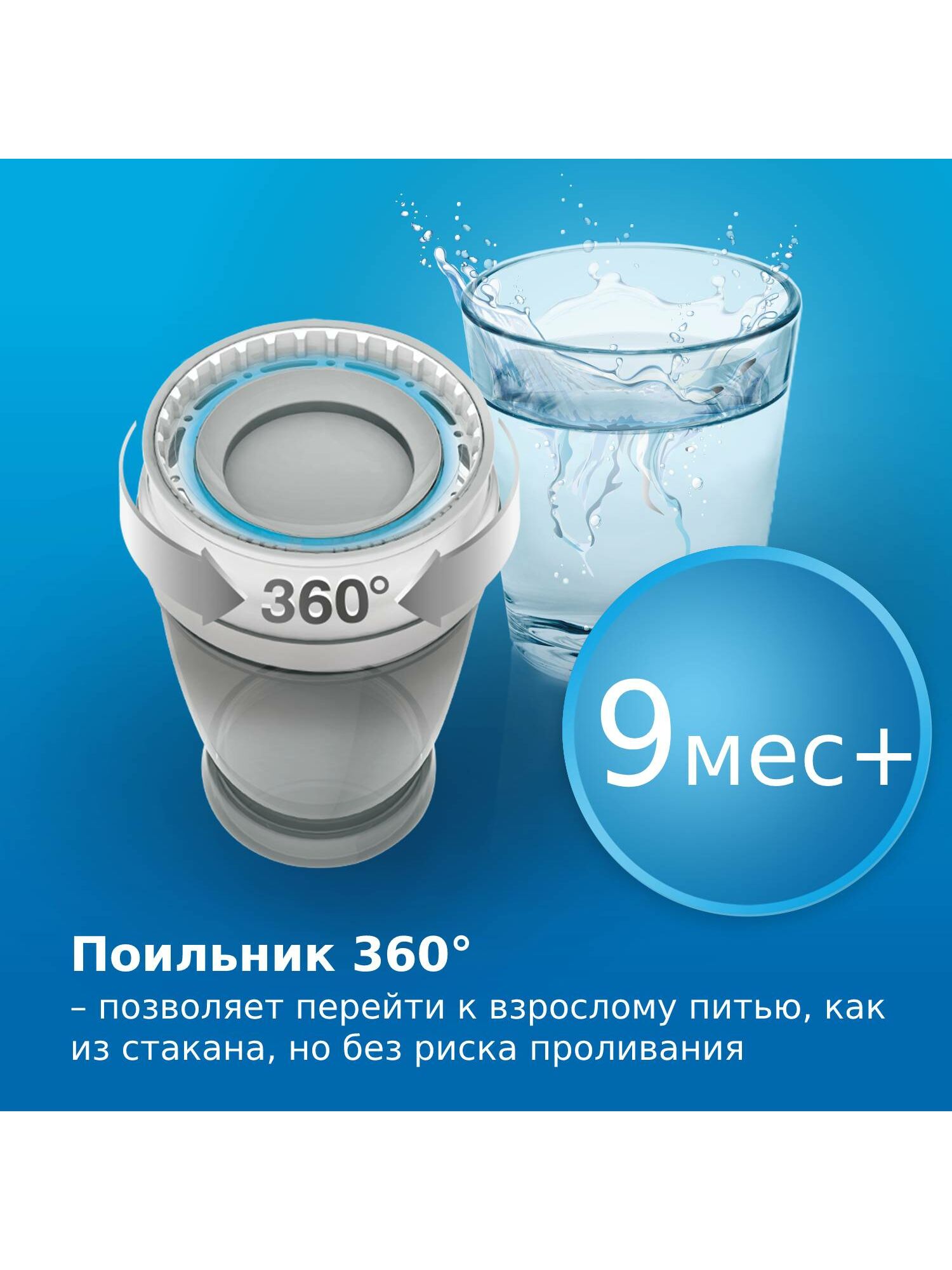 Его инновационная конструкция позволяет ребенку пить с любой стороны, приучаясь к питью из чашки через край, как это делают взрослые; при этом жидкость не проливается.