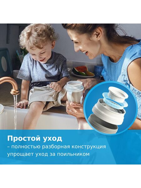 Полностью разборная конструкция упрощает уход за поильником, позволяя с легкостью очистить остатки напитка и загрязнения.