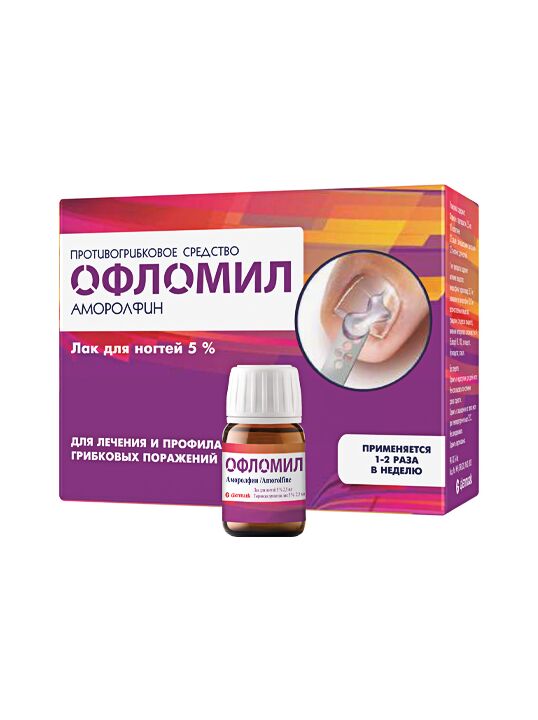 Офломил - противогрибковый препарат для наружного применения. Оказывает фунгистатическое и фунгицидное действие, обусловленное повреждением цитоплазматической мембраны гриба путем нарушения биосинтеза стеролов. Снижает содержание эргостерола, накапливается содержание атипичных стерических неплоских стеролов.