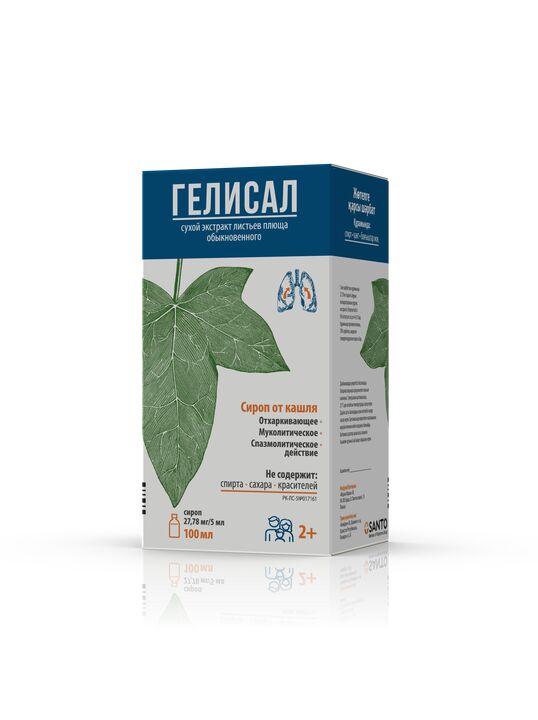 Препарат Гелисал – лекарственное средство растительного происхождения, которое содержит активное вещество – экстракт листьев плюща. Оказывает отхаркивающее, муколитическое действие и слабое спазмолитическое действие на гладкую мускулатуру бронхов. Основой спазмолитического действия является парасимпатолитический эффект гликозидов (сапонинов), активизирующих β-2 рецепторы в мышцах бронхов и эпителия легких. Это приводит к снижению внутриклеточного Сa2+ в мышцах бронхов и их расслаблению. Одновременно альвеолярные клетки II типа продуцируют больше сурфактанта. При непродуктивном (сухом) кашле способствует разжижению вязкой мокроты, облегчает ее отхождение. При продуктивном (влажном) кашле облегчает отхаркивание и выведение мокроты. Благодаря освобождению дыхательных путей от мокроты способствует улучшению дыхания, уменьшению и исчезновению кашля.