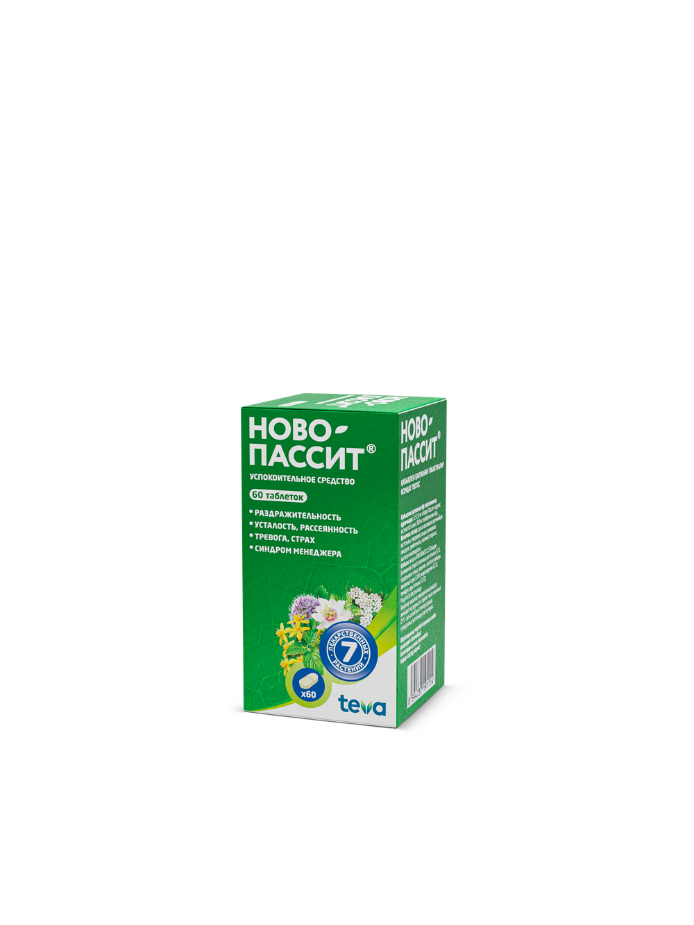 Ново-Пассит® экстракт сухой – 157.5 мг (валериана лекарственная, мелисса лекарственная, зверобой продырявленный, боярышник обыкновенный, пассифлора инкарната (страстоцвет), хмель обыкновенный, бузина черная));