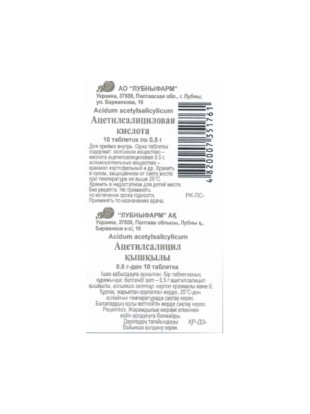 активное вещество – кислота ацетилсалициловая 0,5 г,