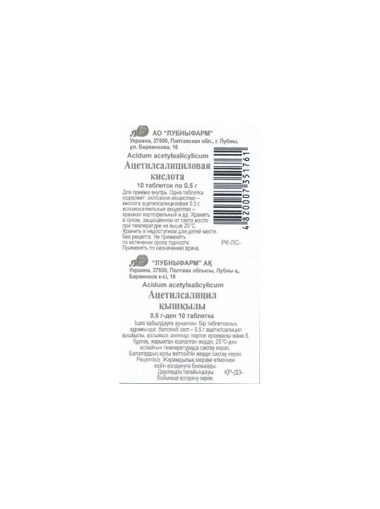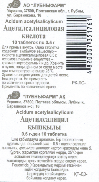 активное вещество – кислота ацетилсалициловая 0,5 г,