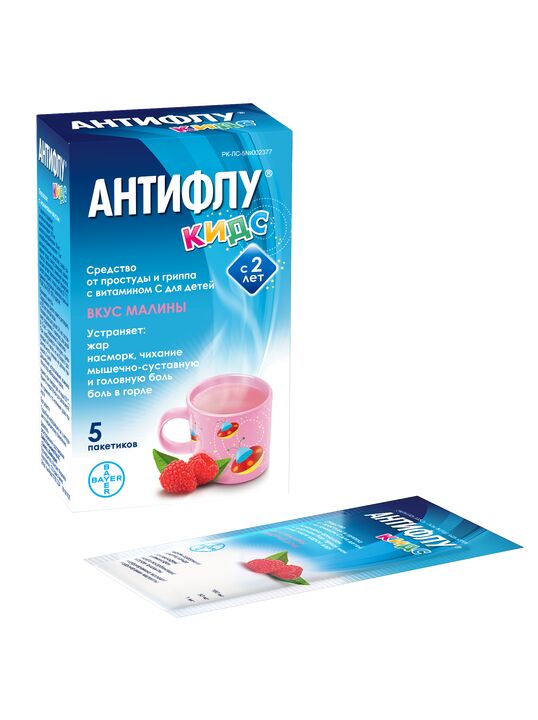 - Антифлу Кидс уменьшает головную, мышечно-суставную боль, боль в горле, устраняет ринорею, зуд в глазах и носу.