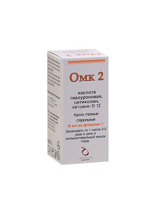 Омк 2 является офтальмологическим раствором, содержащим 0,2% гиалуроновой кислоты с высокой молекулярной массой, полученной путем биотехнологического синтеза, цитиколина 2% и витамин В12. Гиалуроновая кислота повышает мукомиметические, мукоадгезивные и вязкоэластичные свойства растворов, полезные для улучшения стабильности слезной пленки, сохраняя слизистую оболочку смазанной, увлажненной и защищенной.