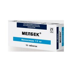 Торговое наименование МЕЛБЕК ®   Международное непатентованное название Мелоксикам   Лекарственная форма, дозировка Таблетки, 7.5 мг    Фармакотерапевтическая группа  Костно-мышечная система. Противовоспалительные и противоревматические препараты....