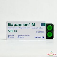 Таблетки, круглой формы с плоской поверхностью от белого до почти белого цвета с надписью «Baralgin-M» на одной стороне и с риской на другой стороне. Состав:  а ктивное вещество - метамизол натрия 500 мг,  вспомогательные вещества:  полиэтиленгликоль 4000, магния стеарат...