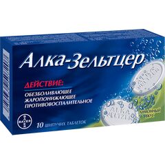 Белые круглые таблетки, плоские, с маркировкой «ALKA SELTZER» на одной стороне и с односторонней фаской – на другой.  Состав: Одна таблетка содержит активные вещества: ацетилсалициловая кислота 324 мг, кислота лимонная безводная 965 мг, натрия гидрокарбонат 1743,87 мг...