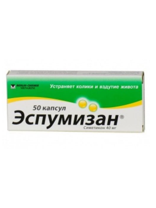 В препарате Эспумизан® капсулы в качестве действующего вещества содержится симетикон — стабильный поверхностно-активный полидиметилсилоксан. Он изменяет поверхностное натяжение пузырьков газа, находящихся в пищевой кашице и в слизи пищеварительного тракта, в результате чего они распадаются. Высвобождающиеся при этом газы могут затем всасываться стенкой кишки, а также выводиться под действием перистальтики кишечника.