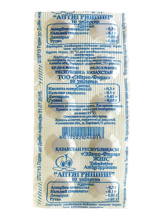 активные вещества: аскорбиновая кислота – 0.30 г, кальция глюконат – 0.10 г, димедрол – 0.02 г, рутин – 0.02 г,
