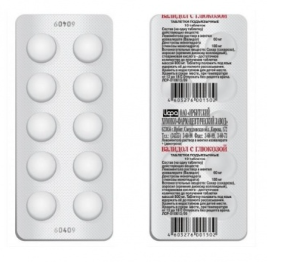 активные вещества: ментола раствор в ментил изовалерате (Валидола) 60.0 мг,