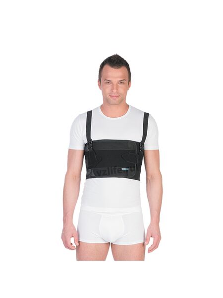 • снабжен наплечными лямками с карабинами для правильного расположения бандажа на грудной клетке