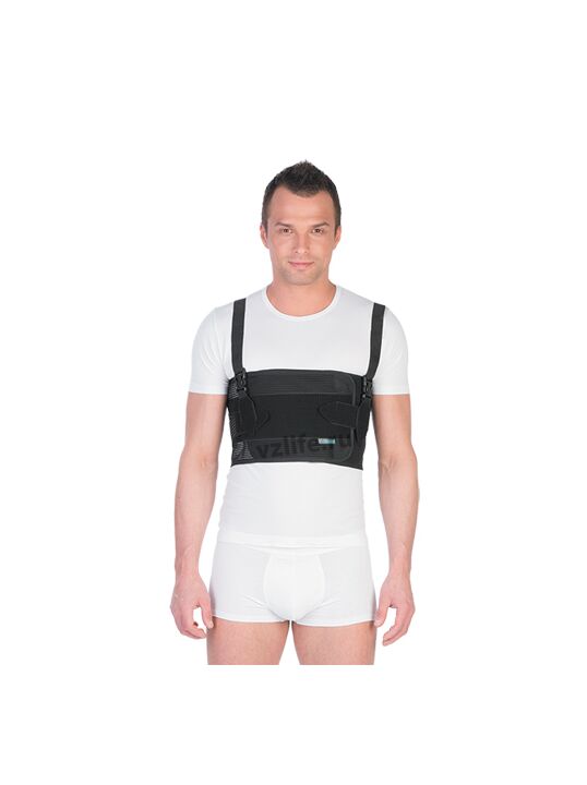 • снабжен наплечными лямками с карабинами для правильного расположения бандажа на грудной клетке