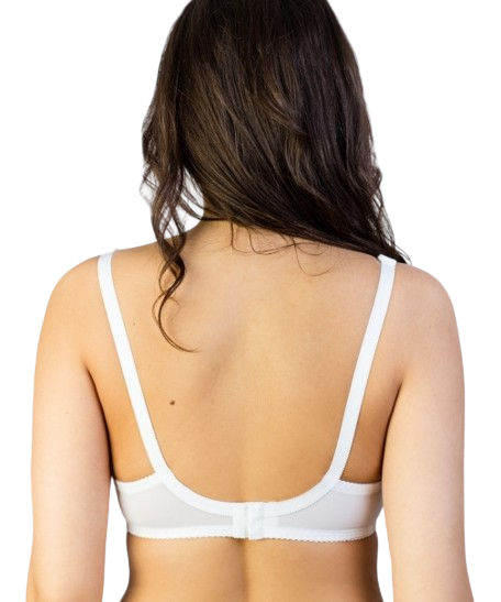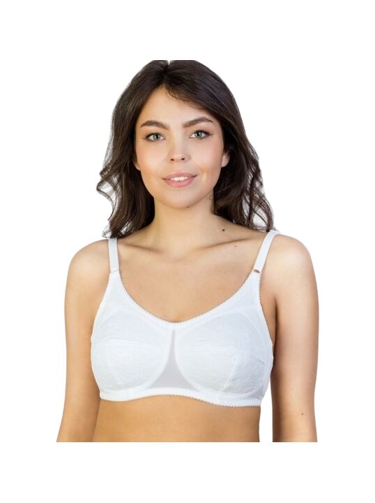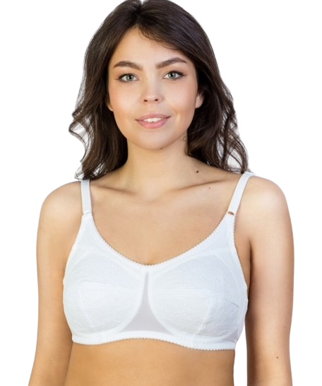 Бюстгальтер из кружевного неэластичного полотна и эластичного полотна, с втачными карманами для протеза из х/б трикотажного полотна. Чашка мягкая. Пояс с застежкой сзади на 2 крючка. Бретель эластичная, с регулировкой длины спереди. Отделка – бантик.