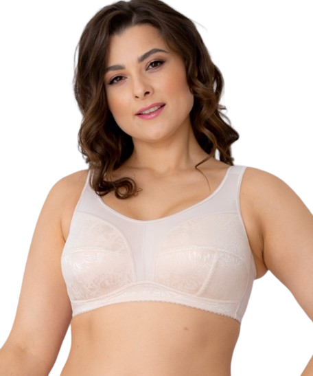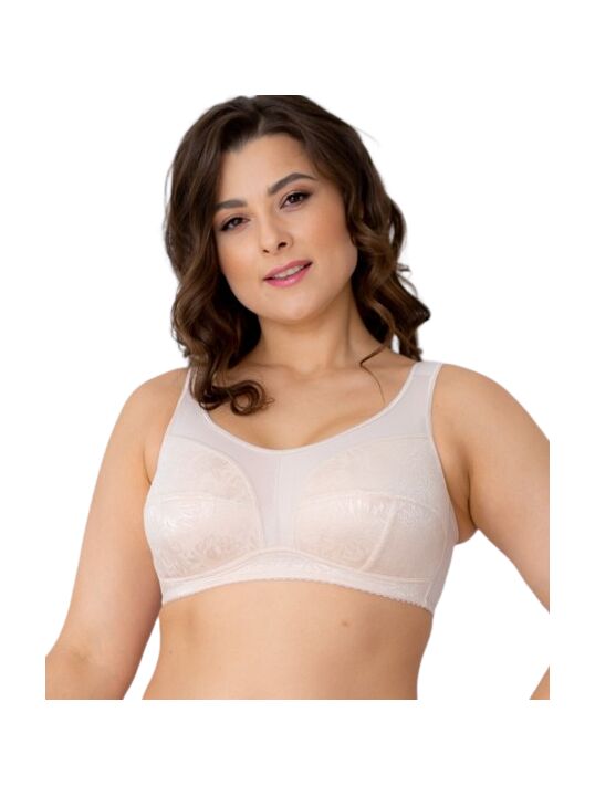 Бюстгальтер из кружевного эластичного полотна, эластичного полотна, с втачными карманами для протеза из х/б трикотажного полотна. Чашка мягкая. Пояс с застежкой сзади на 2-3 крючка. Бретель широкая, на дубляже с хлопком, с регулировкой длины сзади. Отделка – бантик.