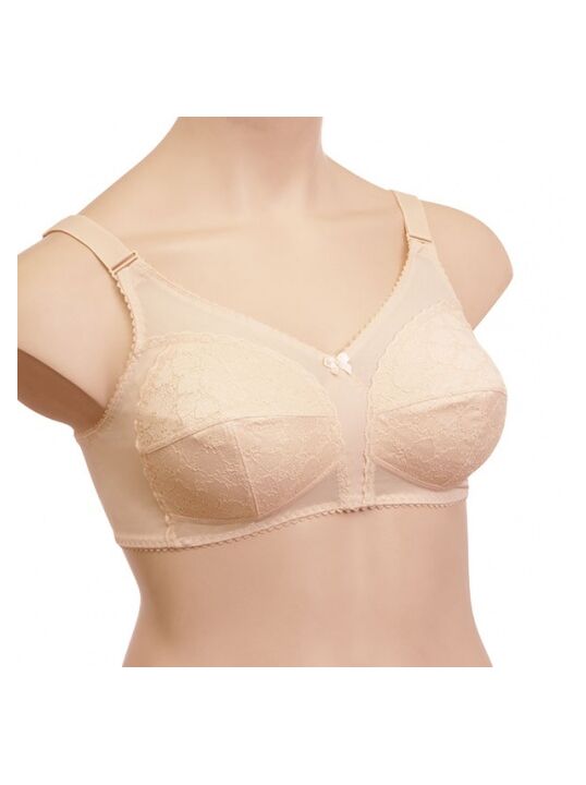 Бюстгальтер из кружевного неэластичного полотна и эластичного полотна, с втачными карманами для протеза из х/б трикотажного полотна. Чашка мягкая. Пояс с застежкой сзади на 3 крючка. Бретель эластичная, с регулировкой длины спереди. Отделка – бантик.