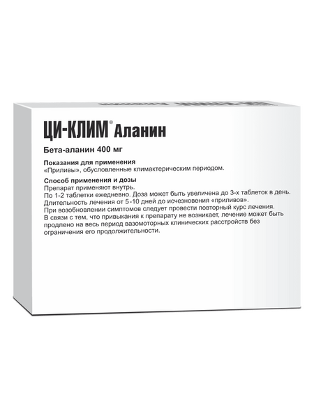 Ци-Клим Аланин – негормональное лекарственное средство, созданное на основе аминокислоты бета-аланин. Эта аминокислота является витаминоподобным веществом, которое естественным образом синтезируется в организме человека и помогает регулировать температуру поверхности тела. С возрастом выработка этого вещества постепенно снижается, из-за чего у женщин могут возникать нарушения естественной терморегуляции – приливы. Чтобы поддерживать нормальную температуру кожи, организму необходимо получать достаточное количество этой аминокислоты из других источников – например, лекарств. Регулярное и длительное применение лекарственных средств способно снизить частоту возникновения приливов и их выраженность.