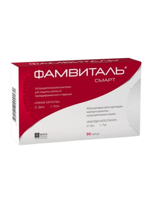 Активные компоненты ФАМВИТАЛЬ® СМАРТ помещены в капсулы двух цветов (жемчужно-красного цвета – день; жемчужно-черного цвета – ночь) с учетом их оптимального сочетания, дозы и биологических ритмов нашего организма.