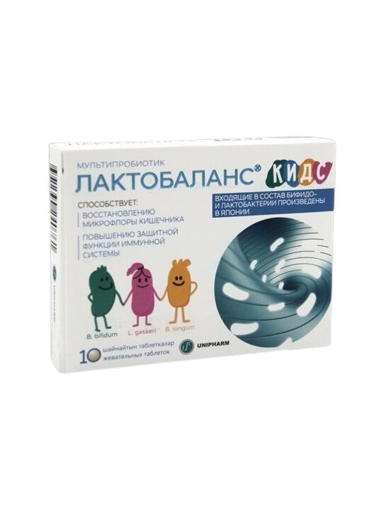 Каждая таблетка ЛАКТОБАЛАНС® КИДС содержит не менее одного миллиарда пробиотических микроорганизмов (1,0 х 109 КОЕ/таб.): В одной таблетке содержится Количество Общее количество живых лактобактерий (L. Gasseri KS-13) не менее 7,5 х 108 КОЕ Общее количество живых бифидобактерий (B. Bifidum G9-1, B. Longum MM-2) не менее 2,5 х 108 КОЕ Состав: фруктоза, декстрин (стабилизатор), крахмал кукурузный (стабилизатор), кальция карбонат (регулятор кислотности), пробиотическая смесь (3ST40FR30) (Lactobacillus gasseri KS-13, Bifidobacterium bifidum G9-1, Bifidobacterium longum MM-2), магниевая соль стеариновой кислоты (стабилизатор), натуральный ванильный ароматизатор.