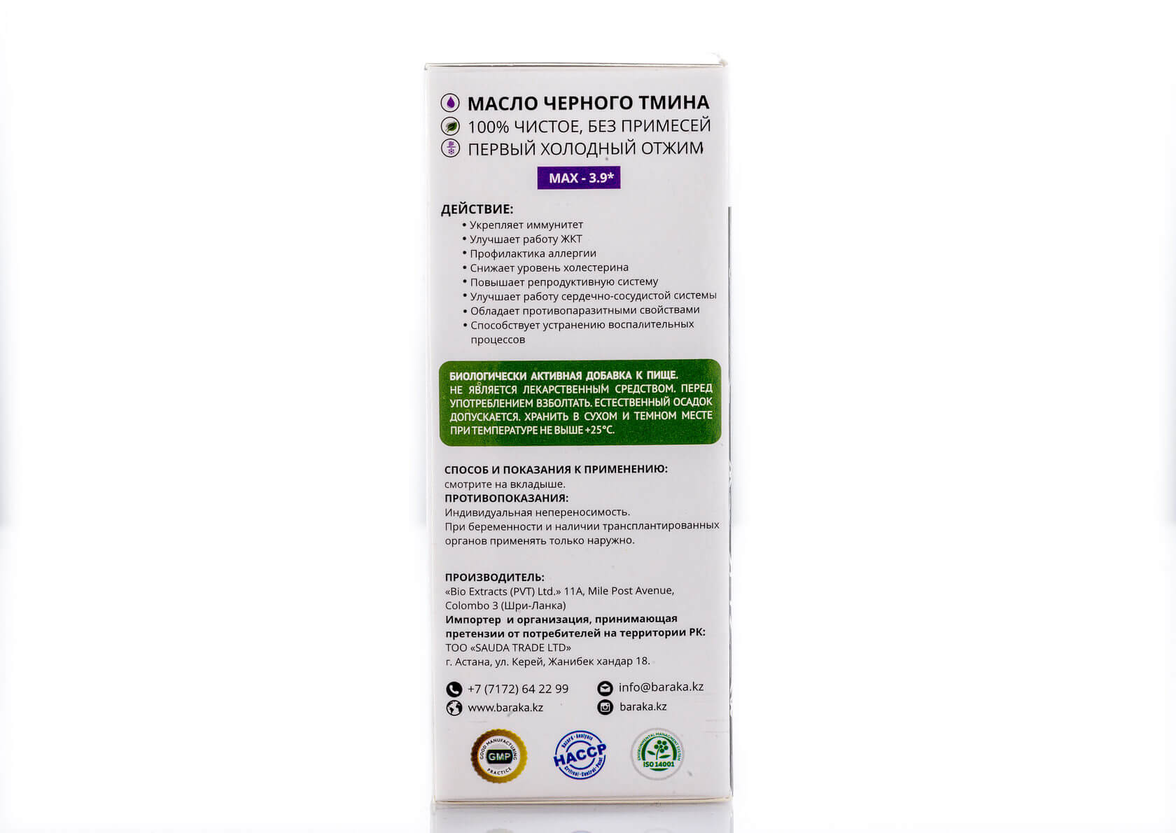 Масло черного тмина Baraka получают механическим путем, методом холодного отжима, из отборных экологически чистых семян, без использования химических веществ и без добавления консервантов, следуя самым высоким стандартам и санитарным нормам на всех этапах производства, что подтверждается рядом международных сертификатов.