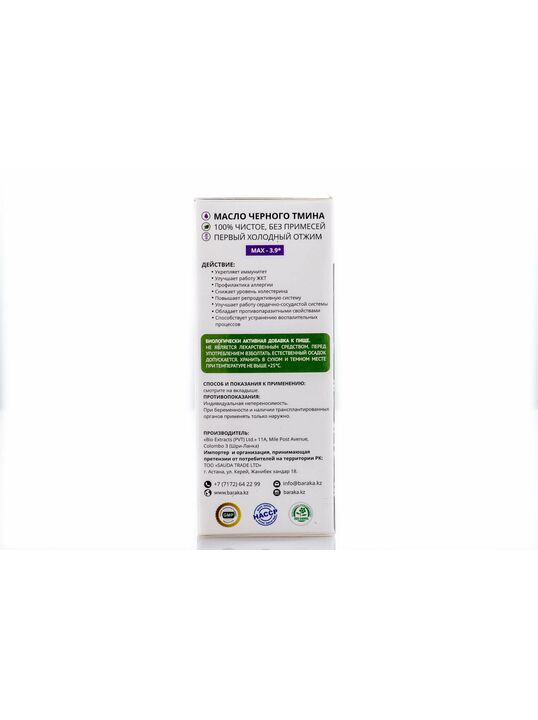 В целом масло черного тмина Baraka обладает иммуностимулирующим эффектом, действуя на вилочковую железу, отвечающую за защитные силы организма. Масло 100% натуральное, не является лекарственным средством.