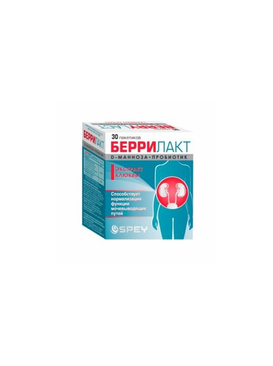 Беррилакт - биологически активная добавка к пище представляет уникальное сочетание пробиотиков, D-маннозы и клюквенного экстракта. Эти три активных компонента поддерживают нормальное функционирование мочевыводящих путей также оказывают благотворное влияние на пищеварительную и иммунную системы. Способствует нормализации функции мочевыводящих путей.