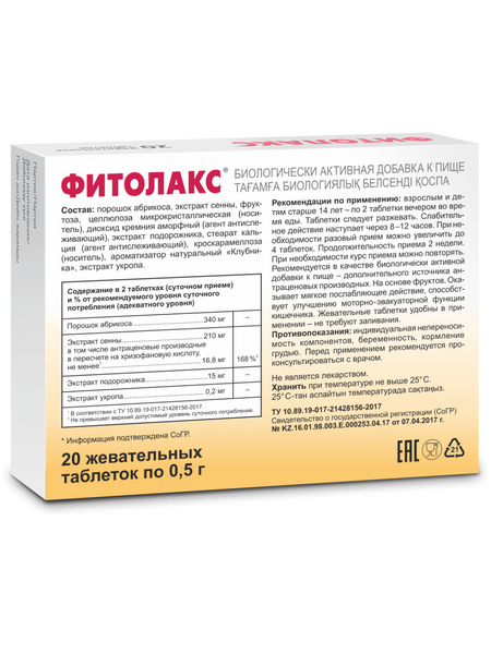 Нарушение функций кишечника, сопровождаемое задержкой стула, - это проблема, с которой в той или иной степени сталкивается практически каждый. Связано это чаще всего с нарушением перистальтики (двигательной активности кишечника). Причины такого нарушения - от неполноценного питания и эмоциональных перегрузок и другие, а следствия - нарушение эвакуаторной функции кишечника, зашлакованность и интоксикации, которые могут привести к отравлению организма. Фитолакс — добавка к пище на основе фруктов. Сочетание фруктов и лекарственных трав в одной таблетке оказывает естественную помощь кишечнику. Действие мягкого послабляющего Фитолакс происходит на протяжении ночи. Вечером - фитолакс, утром - результат. Такой режим приема удобен и совпадает с естественными биоритмами организма. Фруктовые жевательные таблетки Фитолакс приятны на вкус, не требуют запивания и удобны для применения в любой ситуации. Гарантия качества: произведено по международным стандартам GMP. Фитолакс также выпускается в виде шоколада, чая, фруктового батончика и концентрата напитка с приятным вкусом и ароматом, который можно добавлять в любые напитки.