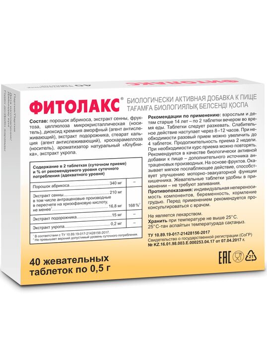Нарушение функций кишечника, сопровождаемое задержкой стула, - это проблема, с которой в той или иной степени сталкивается практически каждый. Связано это чаще всего с нарушением перистальтики (двигательной активности кишечника). Причины такого нарушения - от неполноценного питания и эмоциональных перегрузок и другие, а следствия - нарушение эвакуаторной функции кишечника, зашлакованность и интоксикации, которые могут привести к отравлению организма. Фитолакс — добавка к пище на основе фруктов. Сочетание фруктов и лекарственных трав в одной таблетке оказывает естественную помощь кишечнику. Действие мягкого послабляющего Фитолакс происходит на протяжении ночи. Вечером - фитолакс, утром - результат. Такой режим приема удобен и совпадает с естественными биоритмами организма. Фруктовые жевательные таблетки Фитолакс приятны на вкус, не требуют запивания и удобны для применения в любой ситуации. Гарантия качества: произведено по международным стандартам GMP. Фитолакс также выпускается в виде шоколада, чая, фруктового батончика и концентрата напитка с приятным вкусом и ароматом, который можно добавлять в любые напитки.