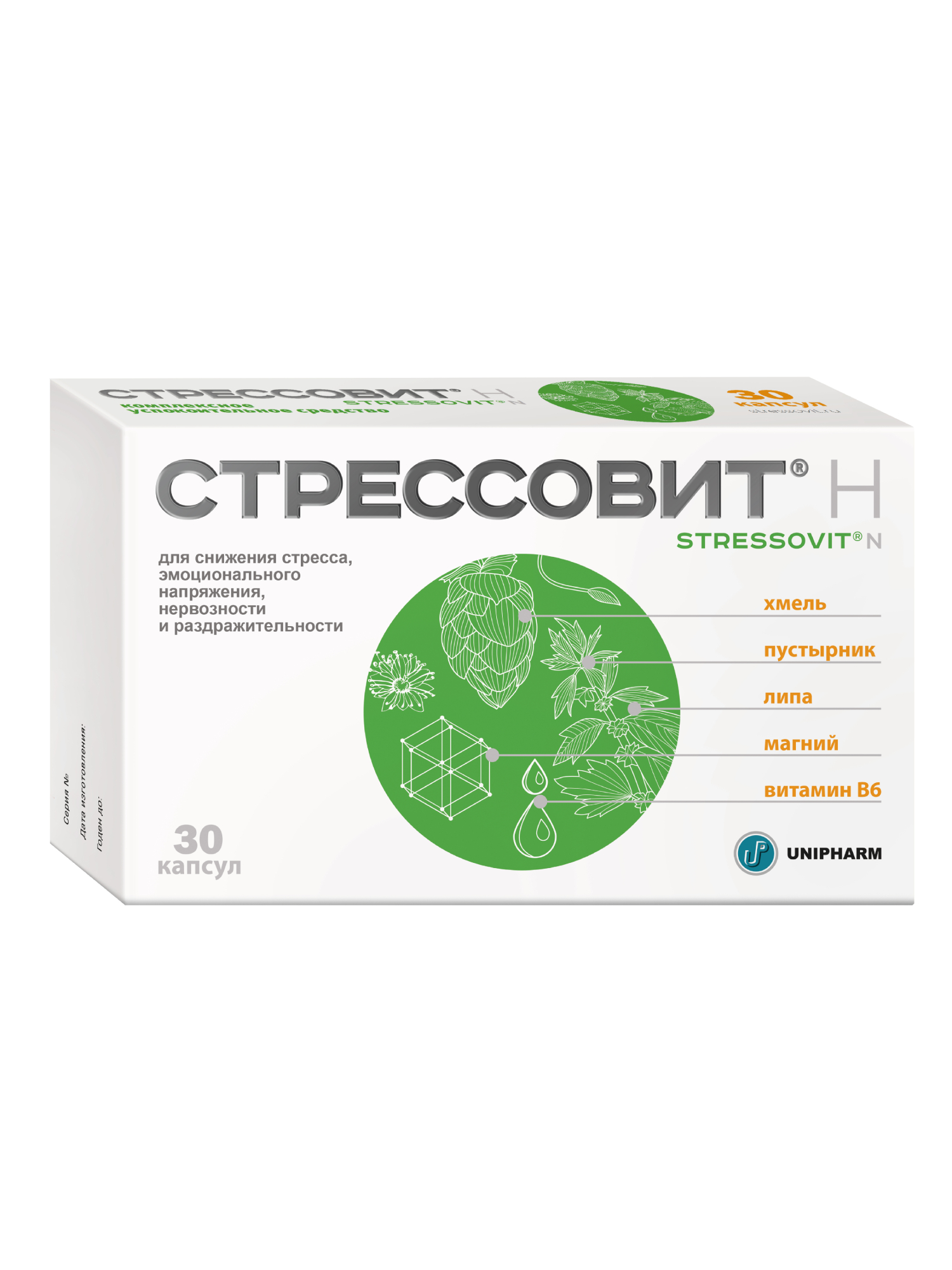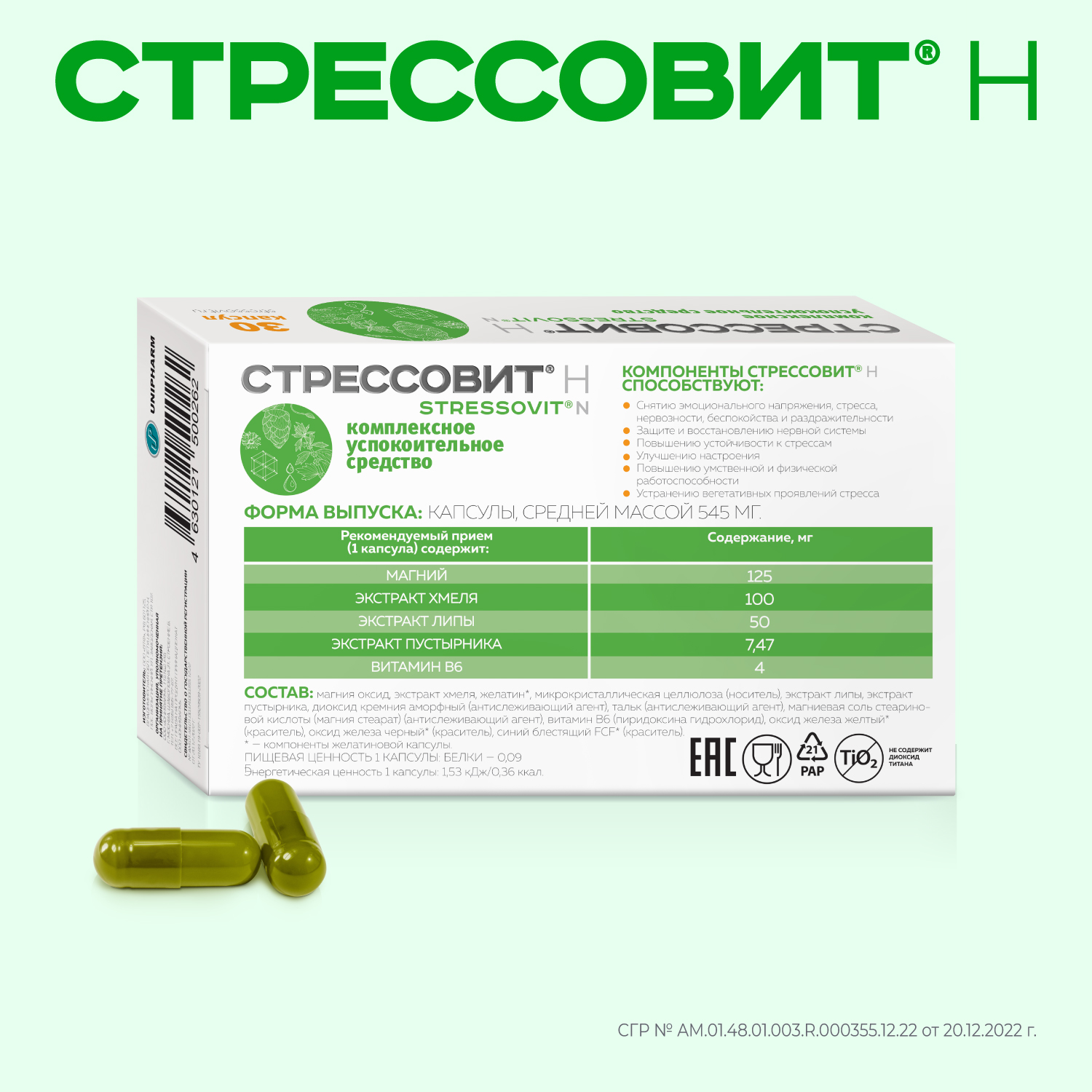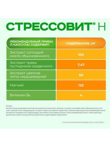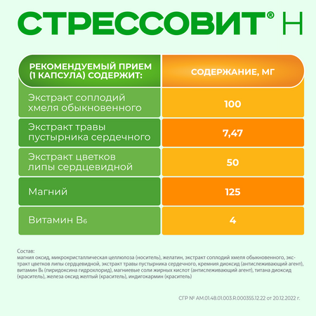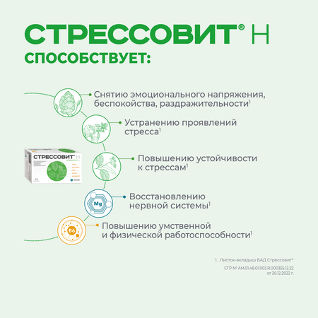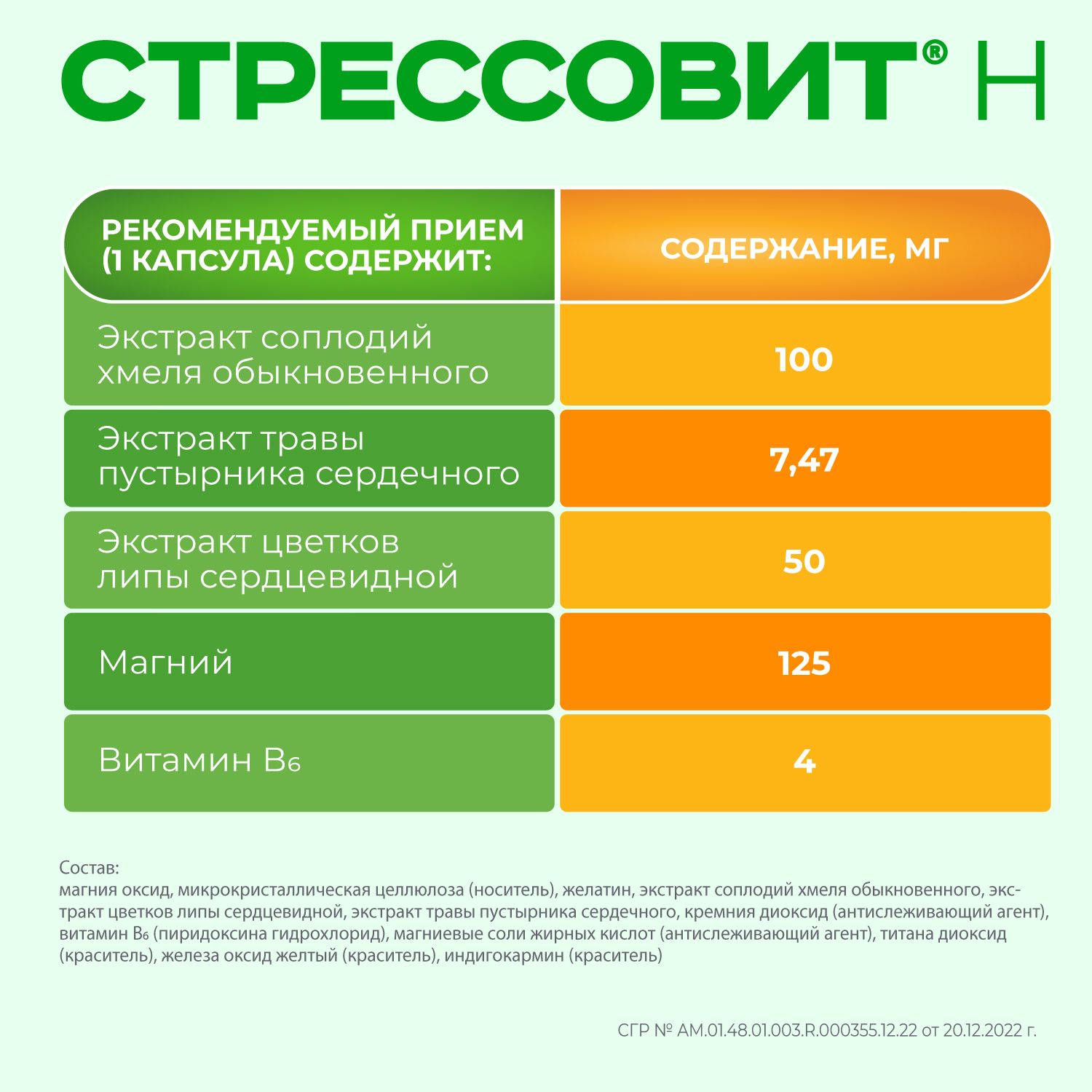 СТРЕССОВИТ® Н – комплекс магния, флавоноидов (экстракт хмеля, липы, пустырника), витамина В6, обладающий мягким успокоительным действием.