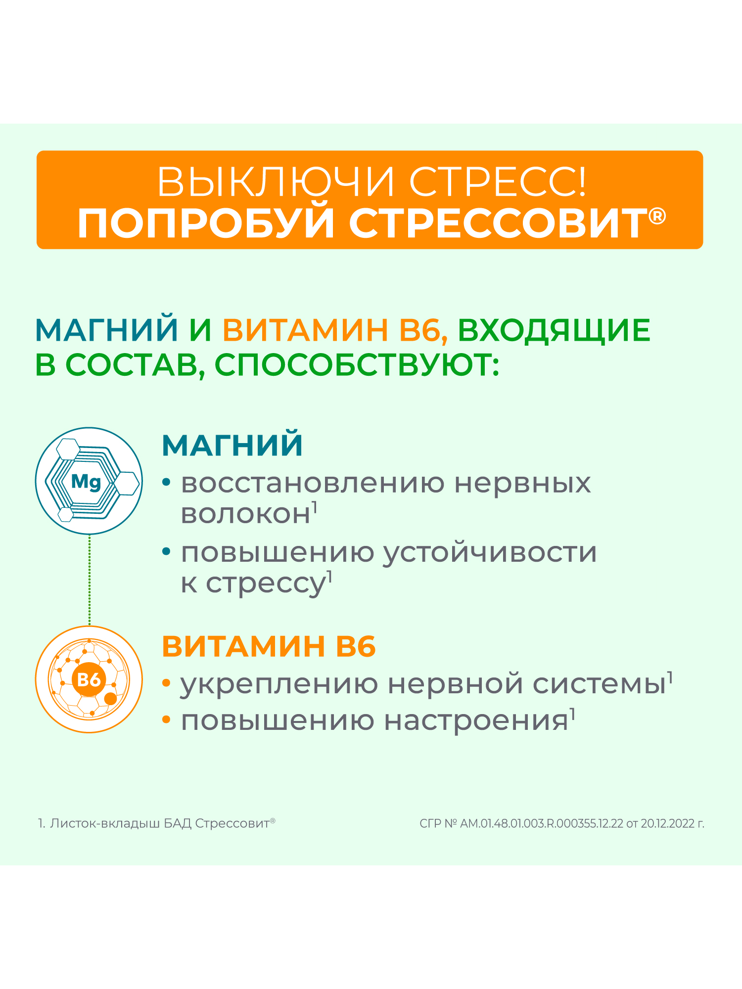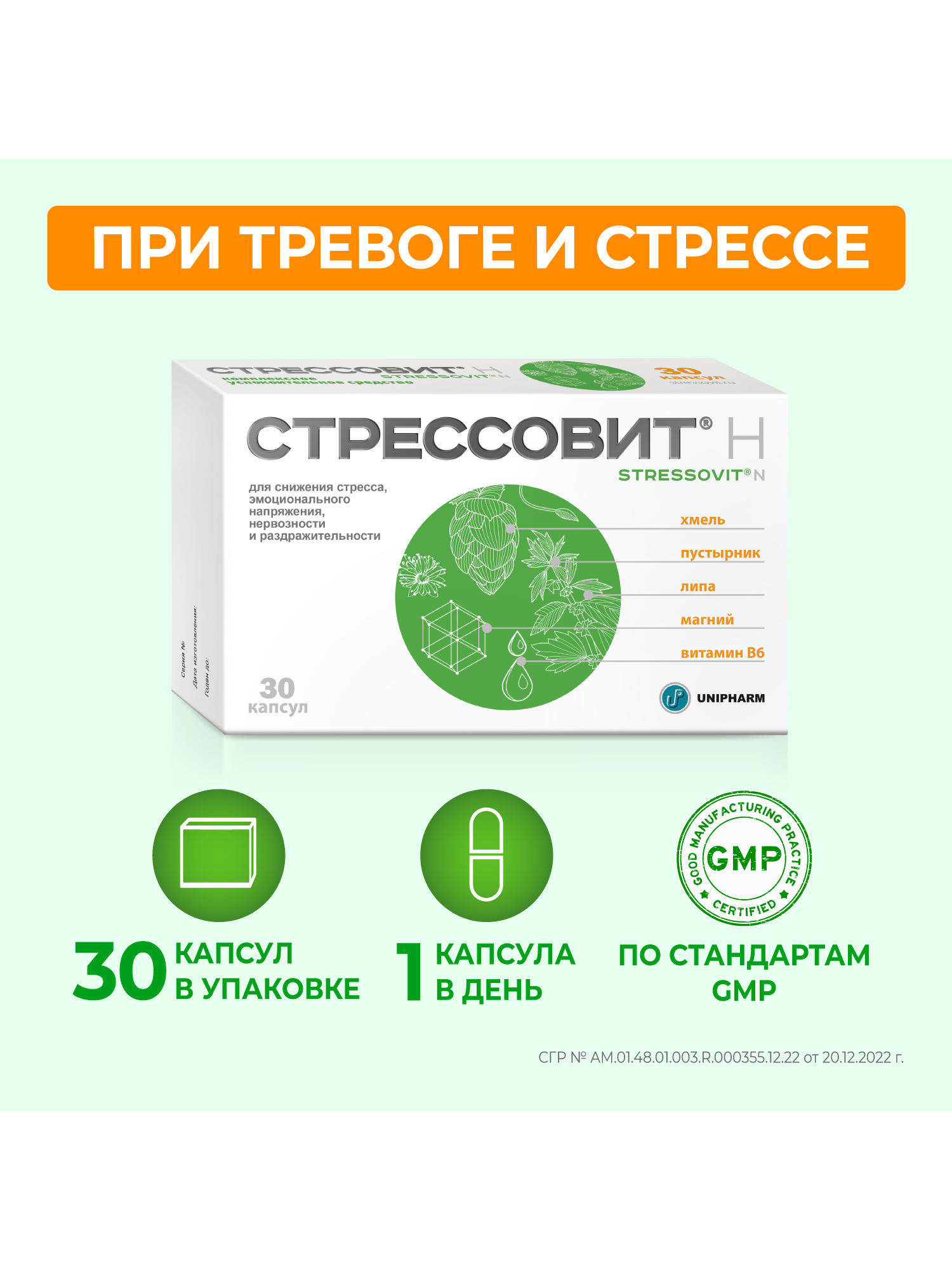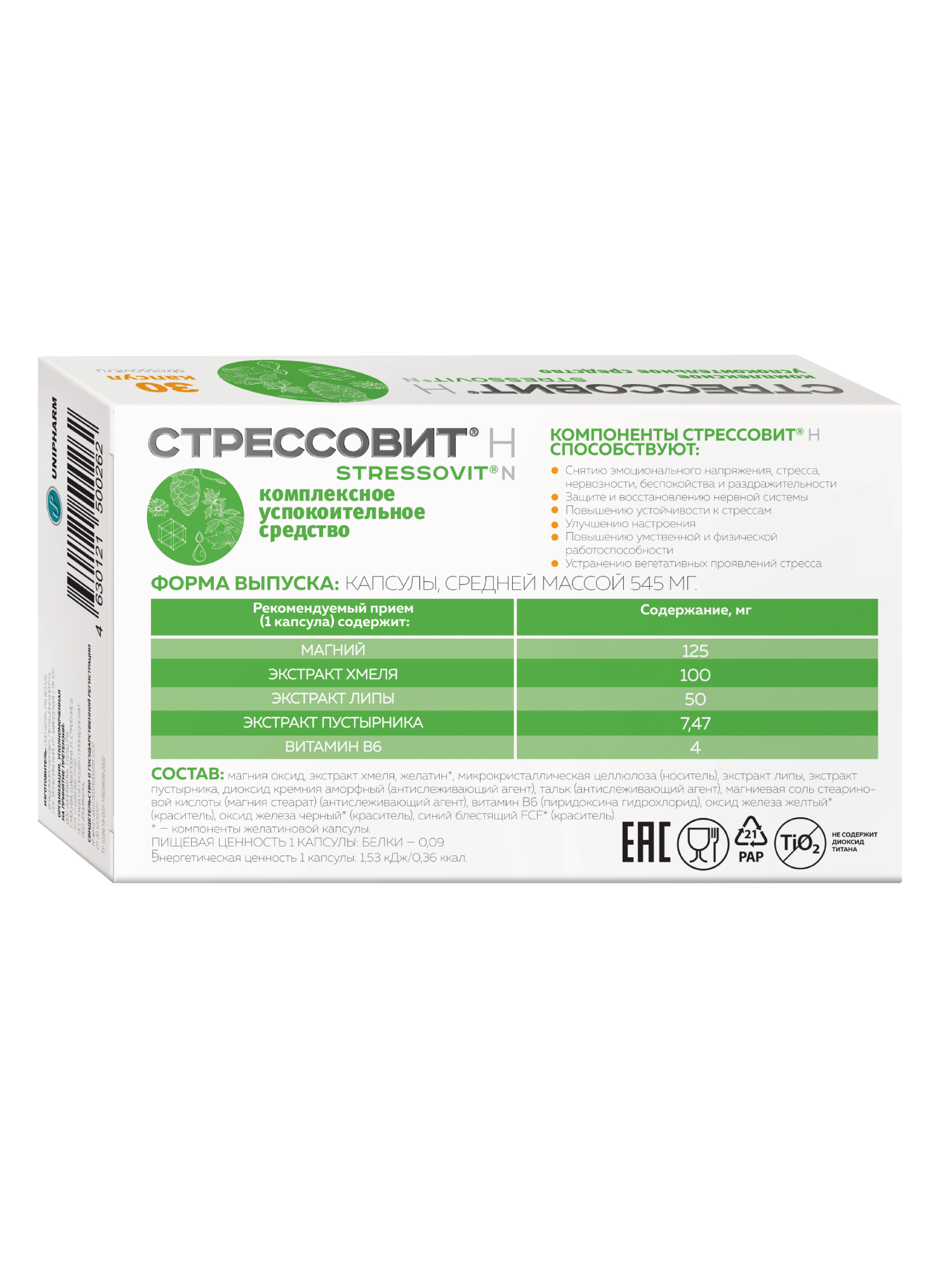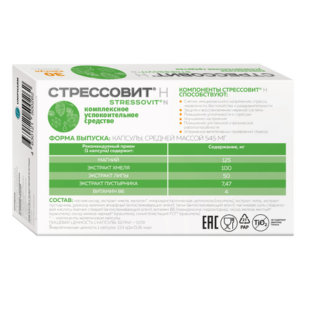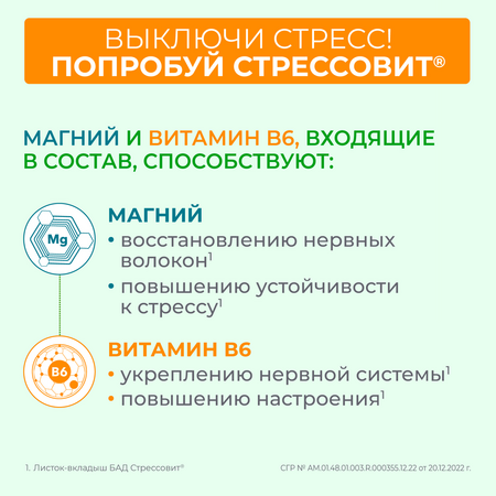 СТРЕССОВИТ® Н – комплекс магния, флавоноидов (экстракт хмеля, липы, пустырника), витамина В6, обладающий мягким успокоительным действием.