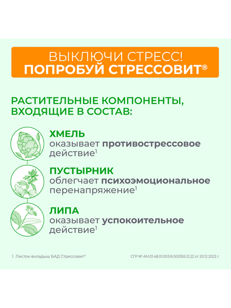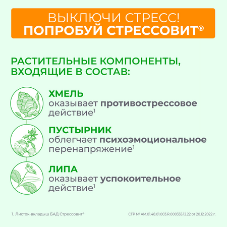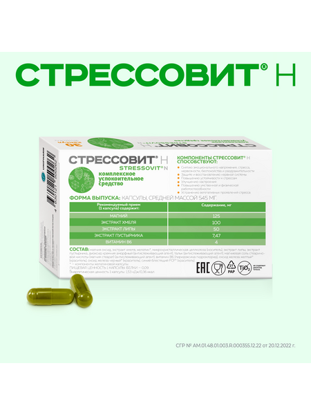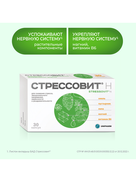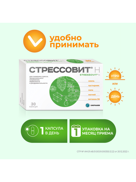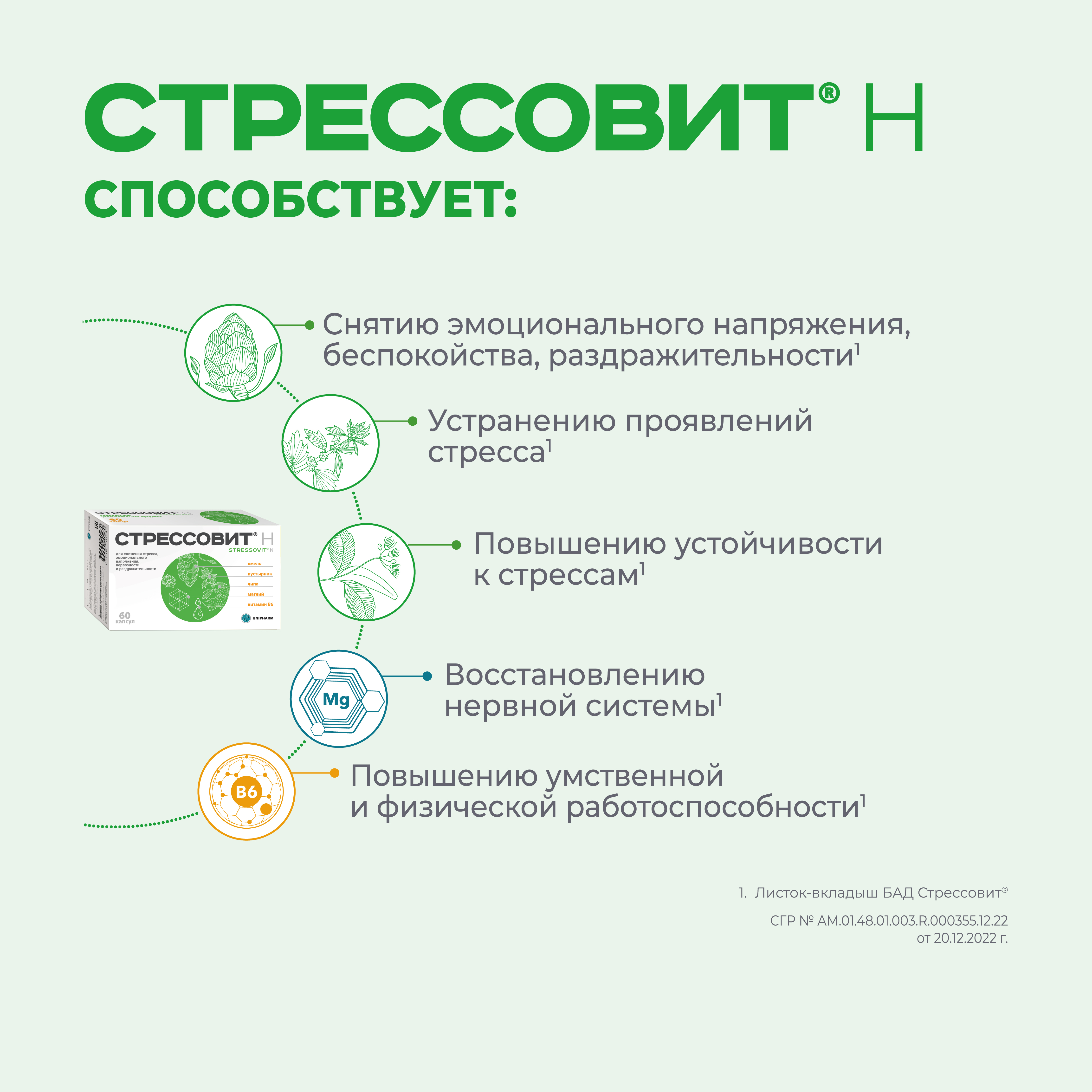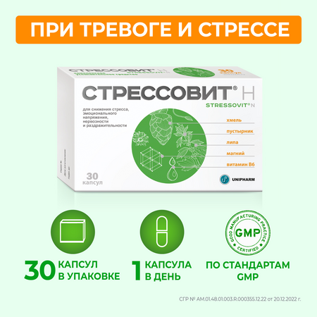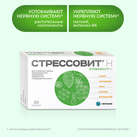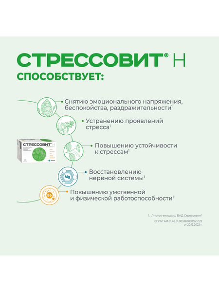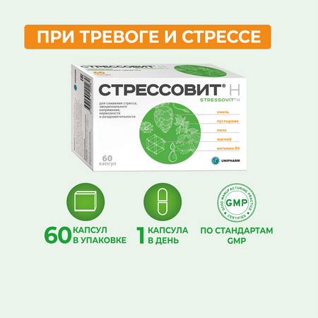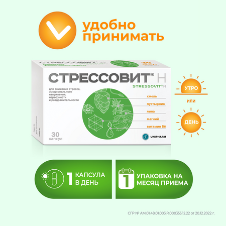 СТРЕССОВИТ® Н – комплекс компонентов, способствующих снижению эмоционального напряжения, снятию стресса, защите и восстановлению нервной системы, улучшению настроения и повышениюумственной и физической работоспособности