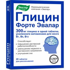 Описание: В каждой таблетке высокое содержание глицина (300 мг), усиленного витаминами для мозга В1, В6, В12. Активное вещество:   глицин, цианокобаламин (витамин В12), пиридоксина гидрохлорид (витамин В6), тиамина гидрохлорид (витамин В1). Действие: для повышения умственной...