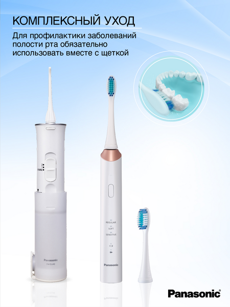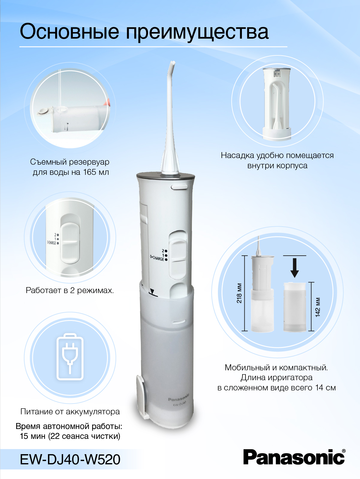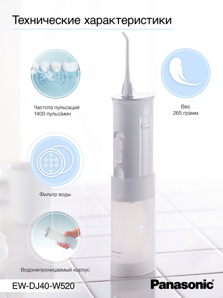 Модель портативного ирригатора полости рта Panasonic EW-DJ40-W520 идеально подходит для использования в домашних условиях и в дороге. Размер ирригатора в сложенном виде 142 мм.