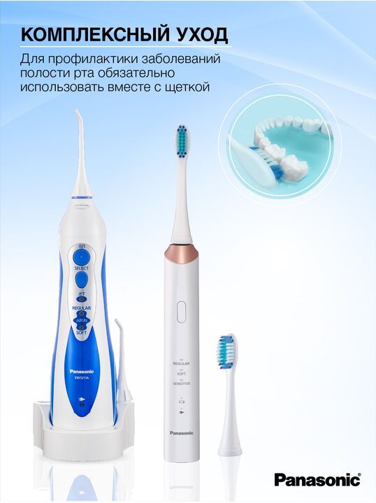С Panasonic EW1211А321 применяются запатентованные универсальные насадки, которые отлично подойдут не только для повседневной чистки зубов и массажа десен, но позволяют с комфортом очистить брекеты, мосты, коронки, виниры. В комплект поставки входят две такие насадки.