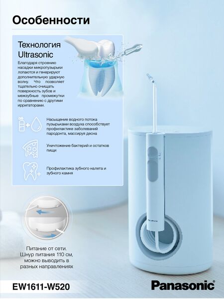 Ирригатор Panasonic EW1611W520 - стационарная модель с запатентованной технологией чистки Ultrasonic генерирует ударные волны, усиливающие эффективность очистки.