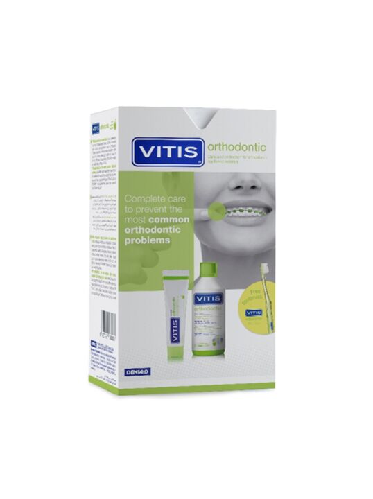 VITIS Ортодонтический набор: паста 100 мл + ополаскиватель 500 мл + зубная щетка ортодонтическая