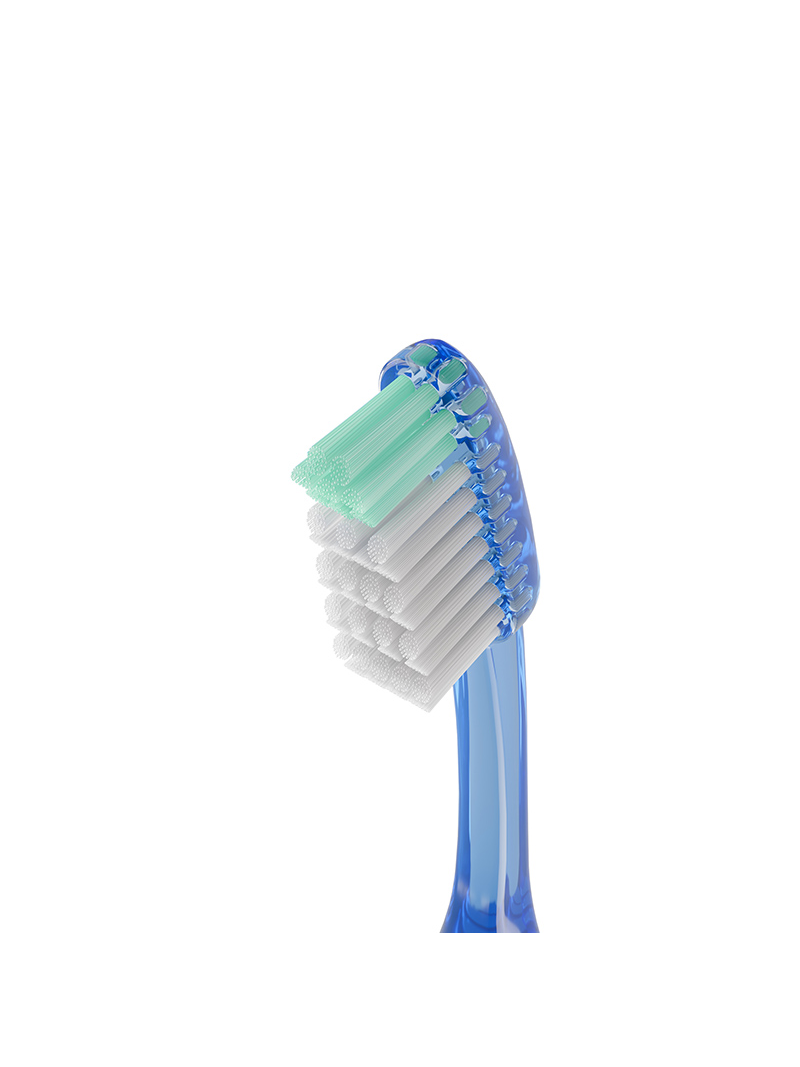 Длина головки 2,7 см. Полнообразный профиль щетины для снижения агрессивного воздействия на мягкие ткани. Оснащена защитным колпачком.