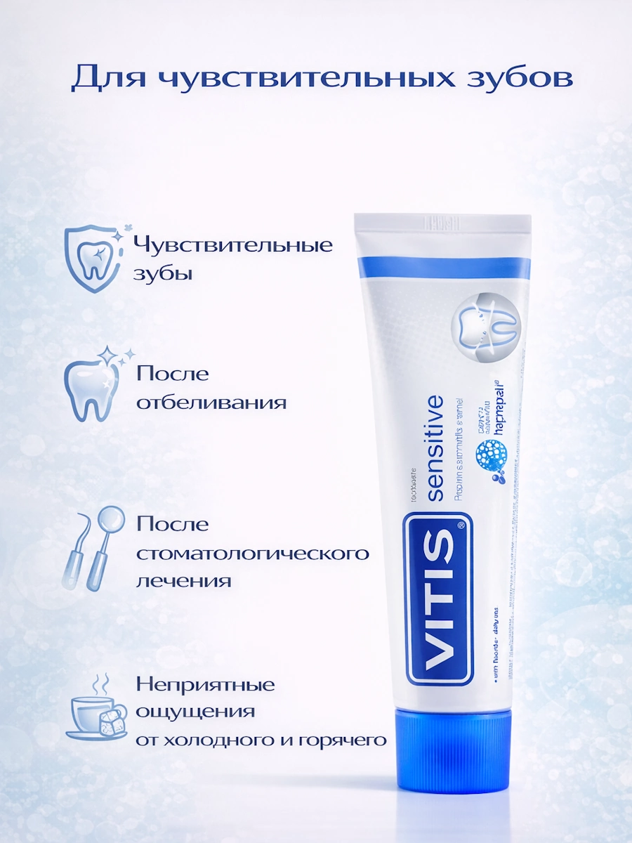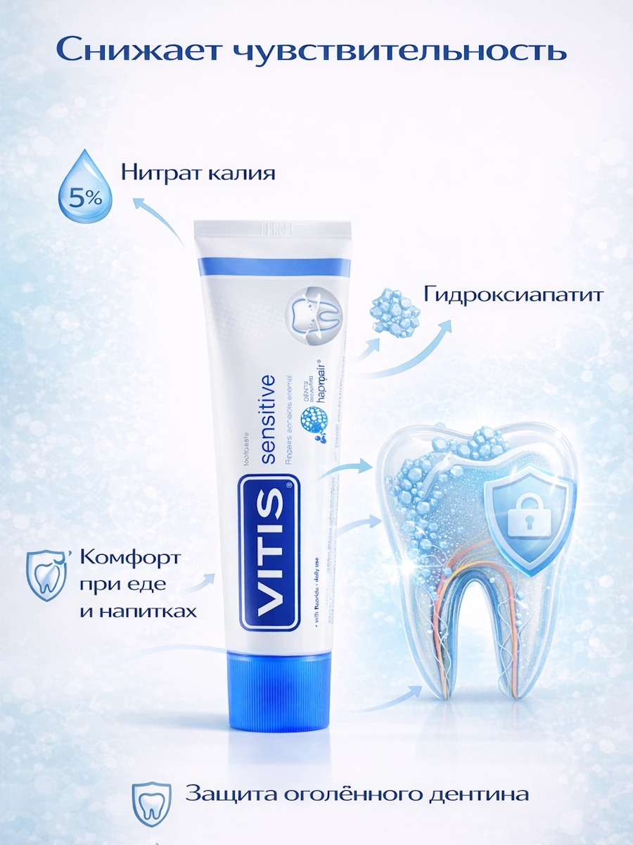 Зубная паста VITIS® Sensitive для устранения повышенной чувствительности зубов, со фтором.