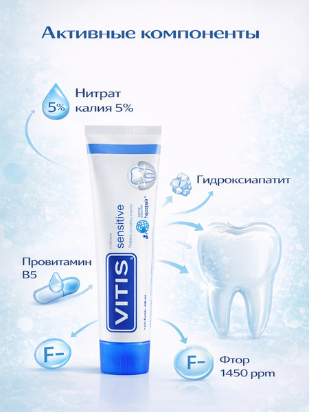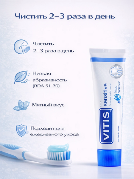 Чистить зубы после каждого приема пищи или не менее 2-3х раз в день. Извлечь небольшое количество зубной пасты на зубную щетку и чистить зубы в течение 3х минут. При сильной чувствительности зубов используйте зубную щетку VITIS® Sensitive или VITIS® Soft, а после чистки прополощите рот ополаскивателем VITIS® Sensitive.